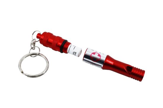 Sifflet d'urgence rouge, sans bille pour fonctionner même mouillé, plus résistant que le plastique et au son strident.