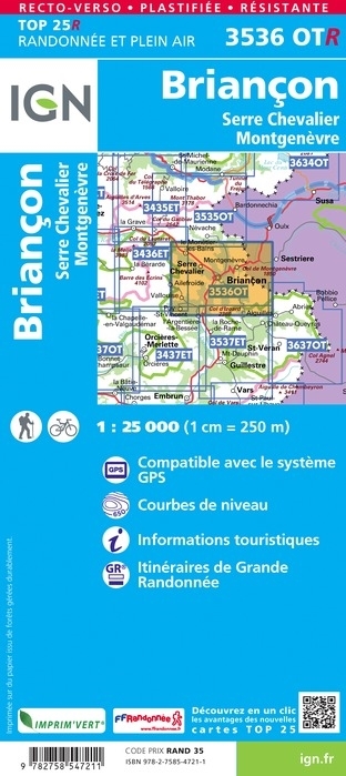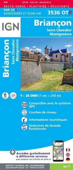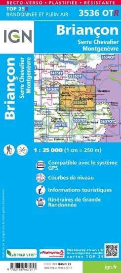 L'indispensable carte de randonnée IGN 3536OTR imprimée en recto-verso aux alentours de Briancon/Serre-Chevalier/Montgenèvre. A conserver dans son sac à dos.