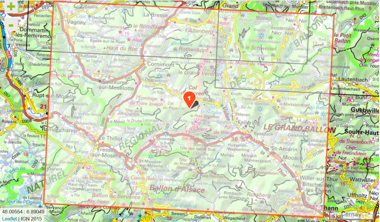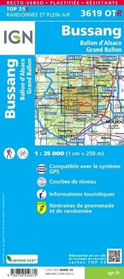 L'indispensable carte de randonnée IGN 3619OTR imprimée en recto-verso aux alentours de Bussang-La-Bresse/Ballon d'Alsace/Grand Ballon. A conserver dans son sac à dos.