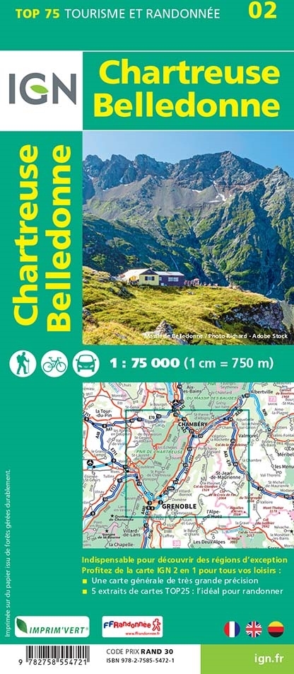En complément, 5 extraits de TOP25 (à l’échelle du 1/25 000) sont intégrés à chaque TOP75 pour pratiquer des randonnées de 1 ou 2 journées dans des sites d’exception. La cartographie IGN à l’échelle du 1/ 25 000 est reconnue pour sa précision par les randonneurs et les alpinistes les plus exigeants.