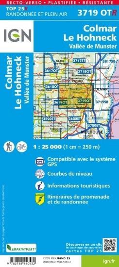 L'indispensable carte de randonnée IGN 3719OTR imprimée en recto-verso aux alentours de Colmar, le Hohneck et la vallée de Munster. A conserver dans son sac à dos.