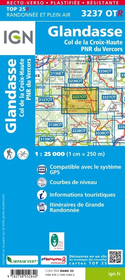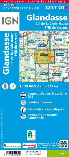 L'indispensable carte de randonnée IGN 3237OTR imprimée en recto-verso aux alentours de Glandasse, du col de la Croix-Haute, du PNR du Vercors. A conserver dans son sac à dos.