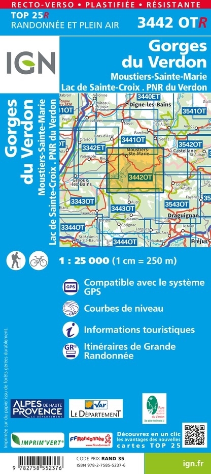 L'incontournable carte de randonnée IGN 3442OTR autour des gorges du Verdon, Moustiers-Sainte-Marie, lac de Sainte-Croix, PNR du Verdon. A emporter dans son sac à dos.