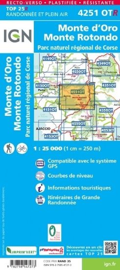 L'indispensable carte de randonnée IGN 4251OTR imprimée en recto-verso aux alentours de Monte D'Oro, Monte Rotondo, du Parc naturel régional de la Corse. A conserver dans son sac à dos.