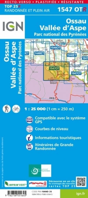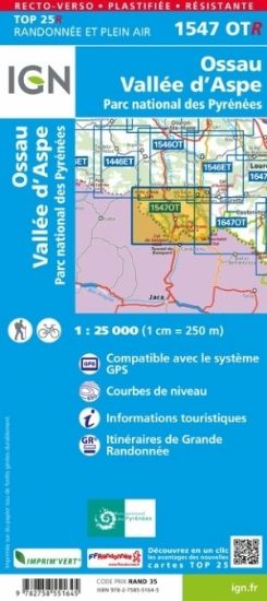 L'indispensable carte de randonnée IGN 1547OTR imprimée en recto-verso aux alentours de Ossau Vallée d'Aspe. A conserver dans son sac à dos.