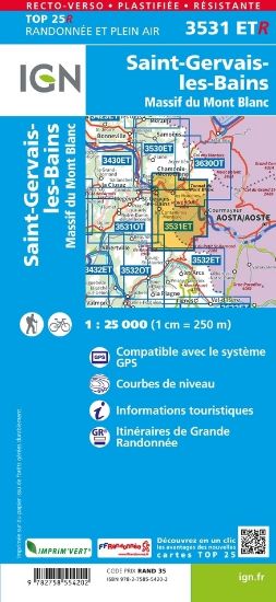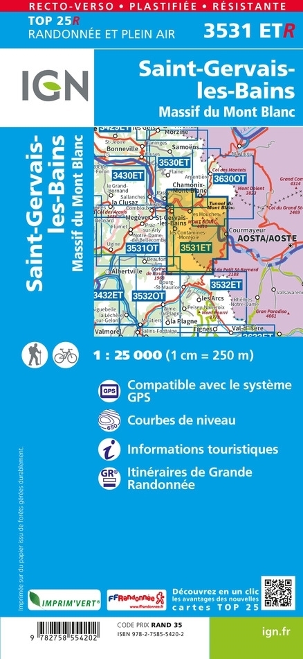 L'indispensable carte de randonnée IGN imprimée en recto-verso aux alentours du massif du Mont-Blanc. A conserver dans son sac à dos.