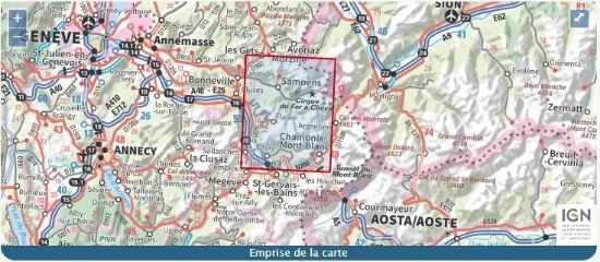 L'indispensable carte de randonnée IGN 3530ETR, imprimée en recto-verso, aux alentours de Samoëns, Chamonix et du massif du Mont Blanc. A conserver dans son sac à dos.