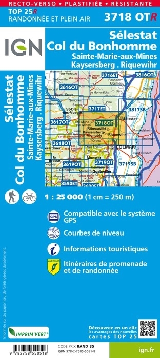 L'indispensable carte de randonnée IGN 3718OTR imprimée en recto-verso aux alentours de Colmar/Kaysersberg. A conserver dans son sac à dos.