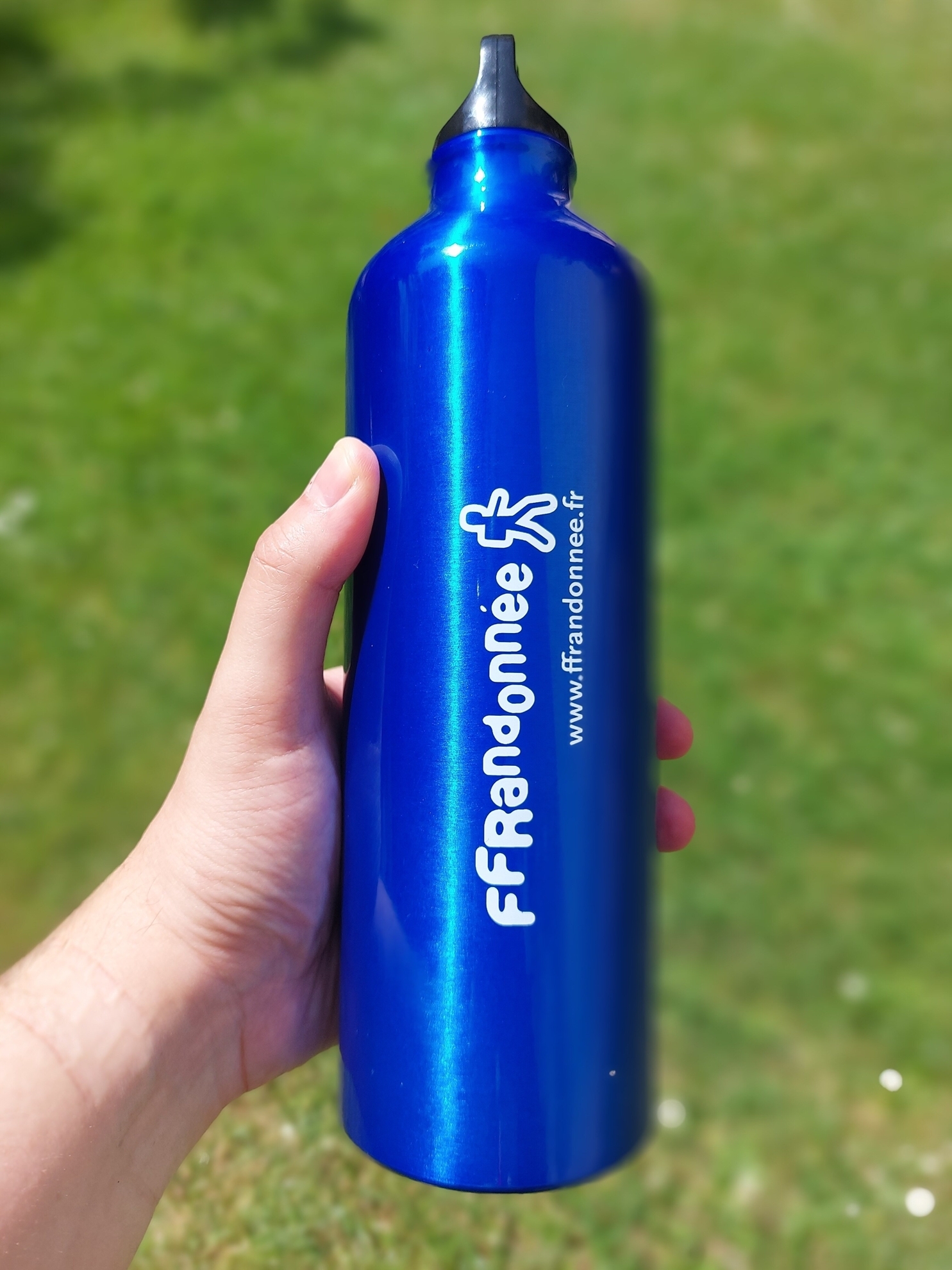 Le marquage FFRandonnée est réalisé par sérigraphie circulaire (screenround), en blanc, sur la surface extérieure.