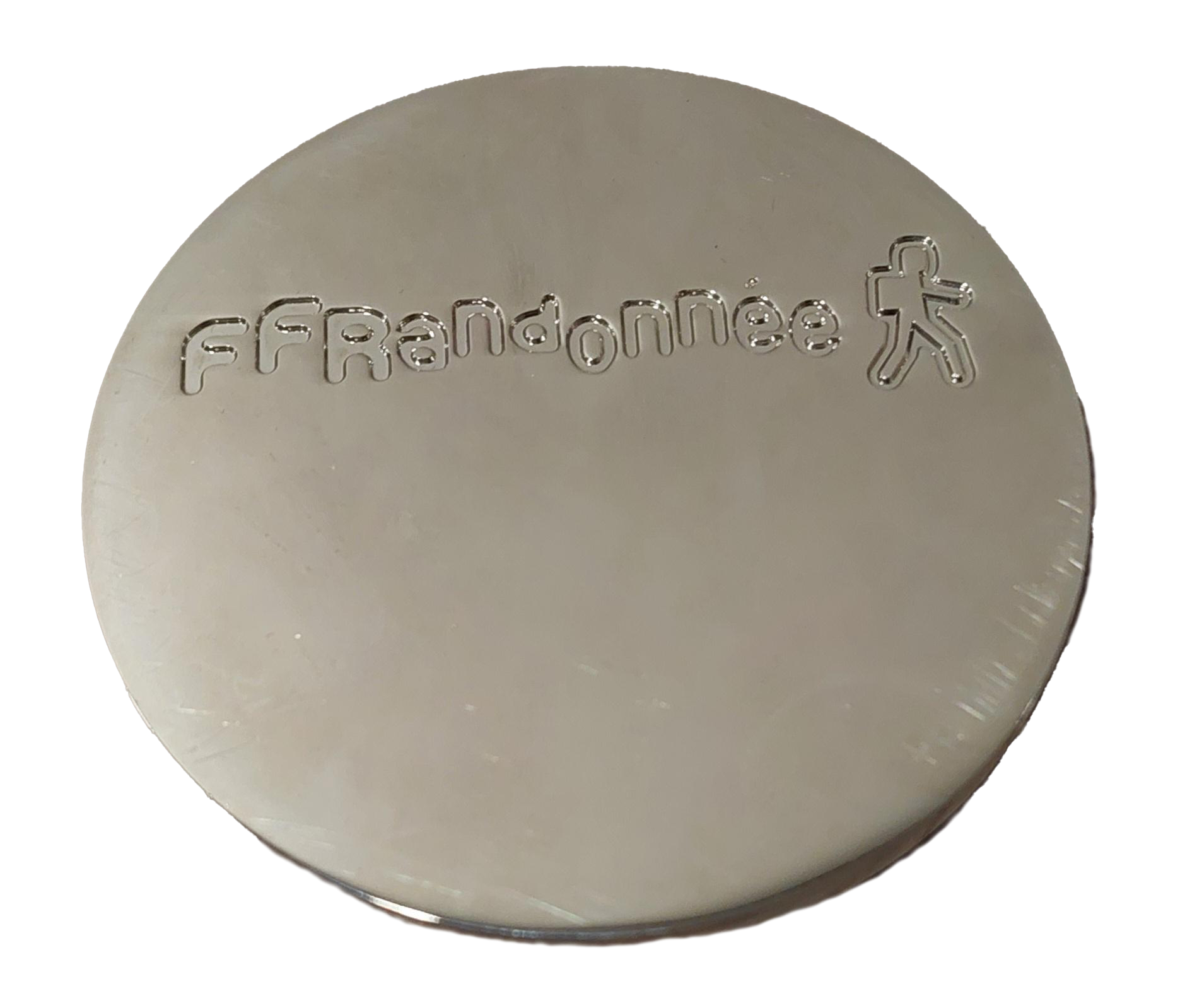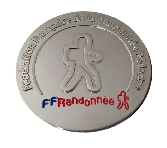 En métal argenté, avec finition brillante et chromée, ces médailles sont gravées en relief et émaillées aux couleurs de la FFRandonnée.