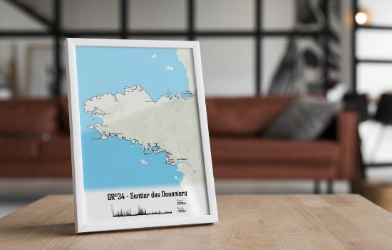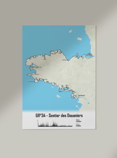 Au format A4, imprimée sur papier brillant coloris Outdoor, cette affiche illustre le tracé du GR®34 dans un style épuré et lumineux.