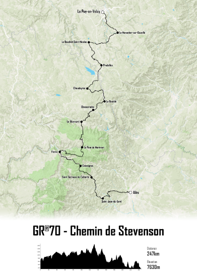 Elle met en avant la progression du chemin depuis les plateaux volcaniques du Velay jusqu’aux paysages cévenols, offrant une lecture fluide du parcours.