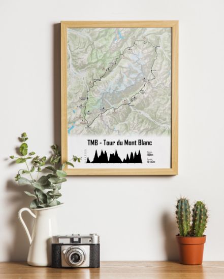 Au format A4, imprimée sur papier brillant coloris Outdoor, cette affiche représente le tracé complet du TMB dans un style graphique élégant et lisible.