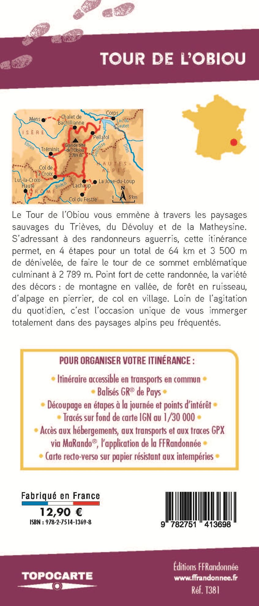 Cette Topocarte recto-verso au 1/30 000 présente l’intégralité du GR® de Pays « Tour de l’Obiou », soit :