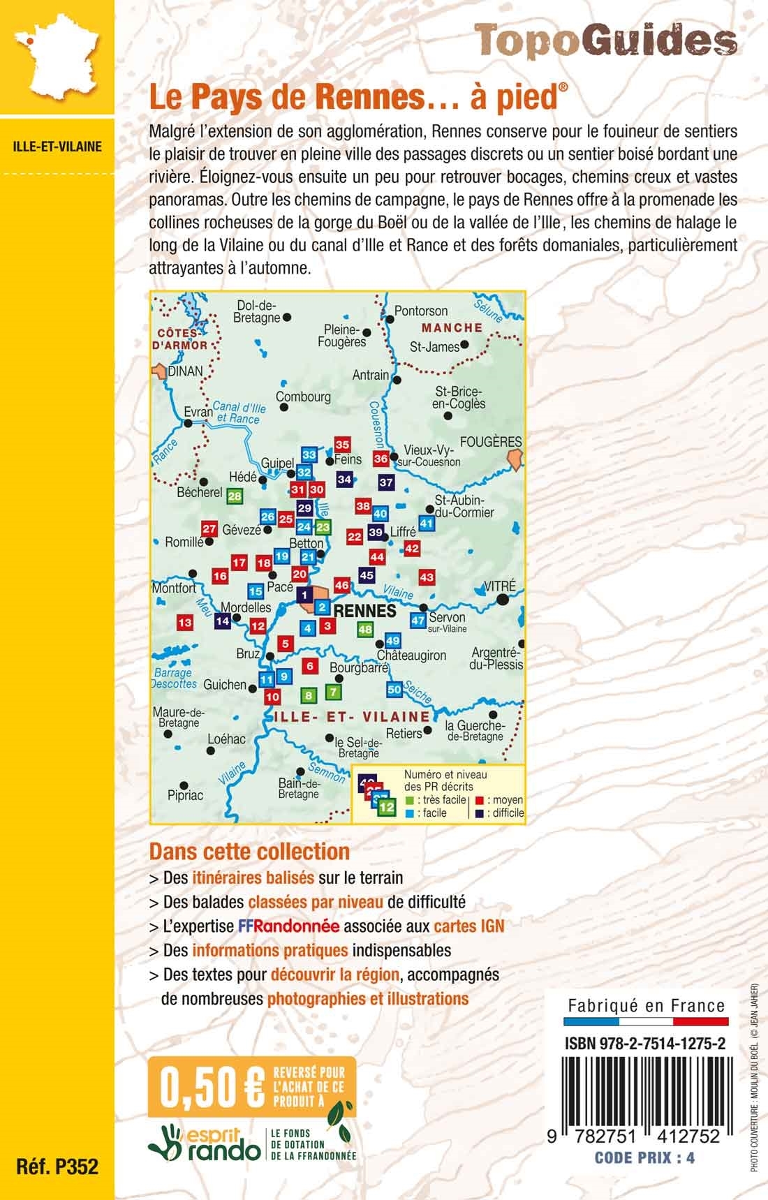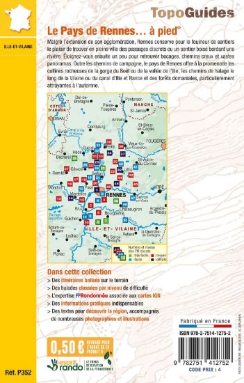 Ce topoguide rassemble 50 randonnées autour de Rennes et ses espaces verts comme la forêt de Rennes, les collines boisées de Boël surplombant la Vilaine et le canal d'Ille et Rance.