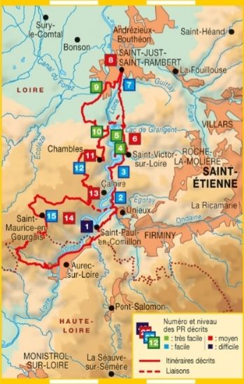 Aux portes de Saint-Etienne, le fleuve Loire offre un terrain original de randonnée avec méandres, rochers, vallons secrets, landes, forêts et châteaux. Ces sentinelles médiévales veillent toujours sur un fleuve aujourd'hui assagi dans les eaux du lac de Grangent. 15 circuits PR, souvent accessibles en famille, et un nouvel itinéraire de Grande Randonnée (GR de Pays) de 2, 3 ou 4 jours du Velay au Forez, invitent à redécouvrir un site protégé et riche en hébergements touristiques.