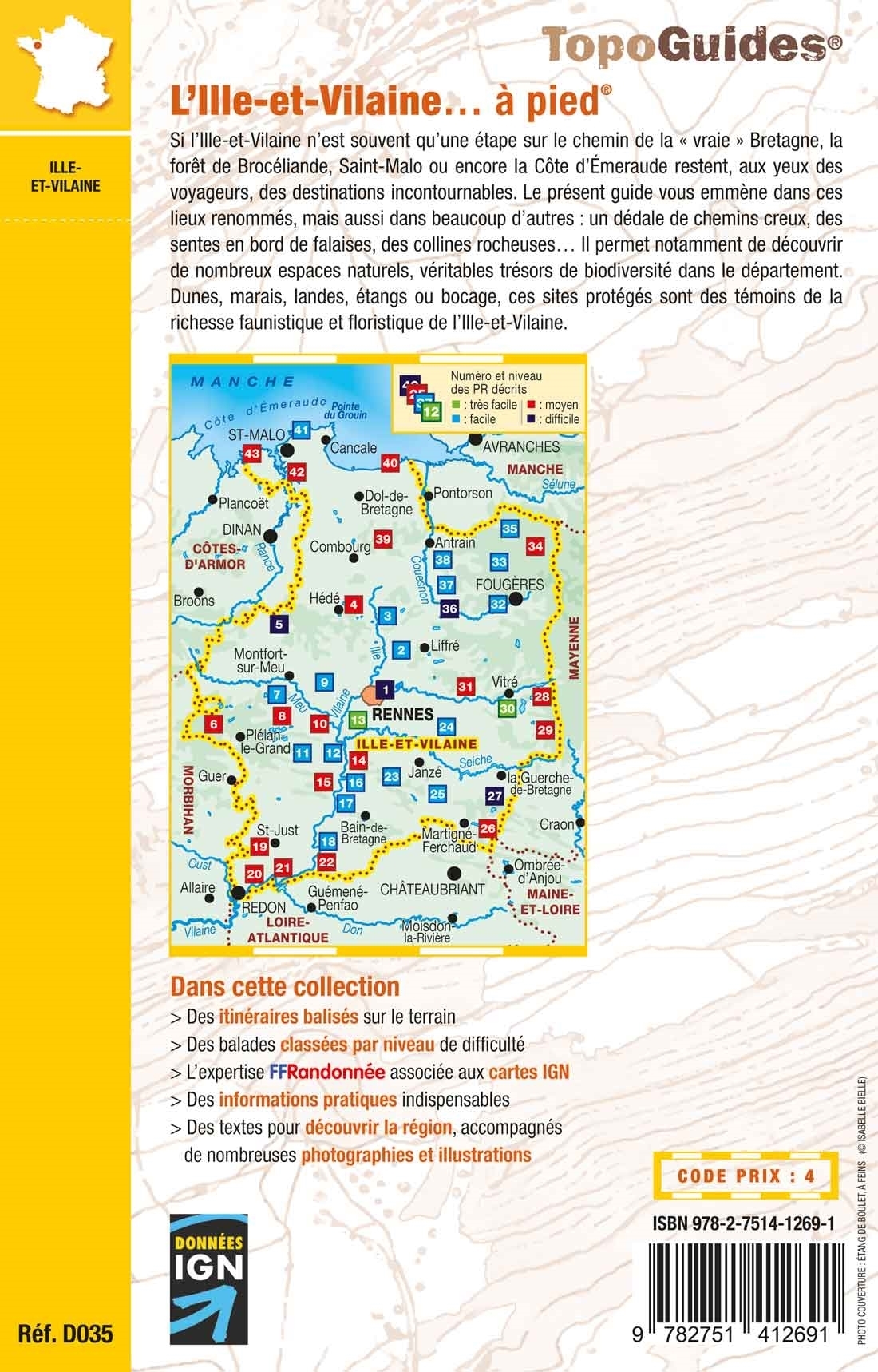 Ce topoguide vous emmène dans ces lieux renommés, mais aussi dans beaucoup d'autres : un dédale de chemins creux, des sentes en bord de falaises, des collines rocheuses... Il permet notamment de découvrir de nombreux espaces naturels, véritables trésors de biodiversité dans le département. Dunes, marais, landes, étangs ou bocage, ces sites protégés sont des témoins de la richesse faunistique et floristique de l'Ille-et-Vilaine.