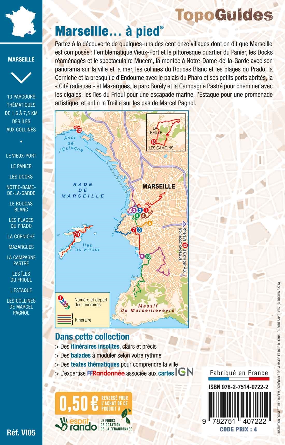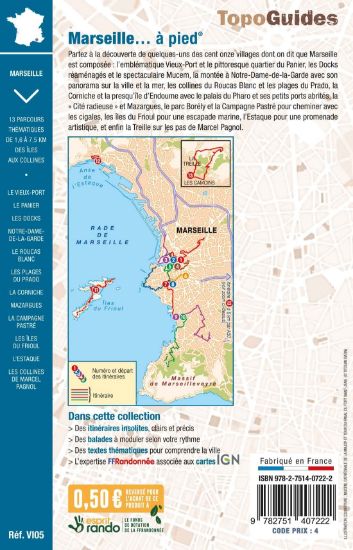 Partez à la découverte de quelques-uns des cent onze villages dont on dit que Marseille est composée : l'emblématique Vieux-Port et le pittoresque quartier du Panier, les Docks réaménagés et le spectaculaire Mucem, la montée à Notre-Dame-de-la-Garde avec son panorama sur la ville et la mer, les collines du Roucas Blanc et les plages du Prado, la Corniche et la presqu'île d'Endoume avec le palais du Pharo et ses petits ports abrités, la "Cité radieuse" et Mazargues, le parc Borély et la Campagne Pastré pour cheminer avec les cigales, les îles du Frioul pour une escapade marine, l'Estaque pour une promenade artistique, et enfin la Treille sur les pas de Marcel Pagnol.